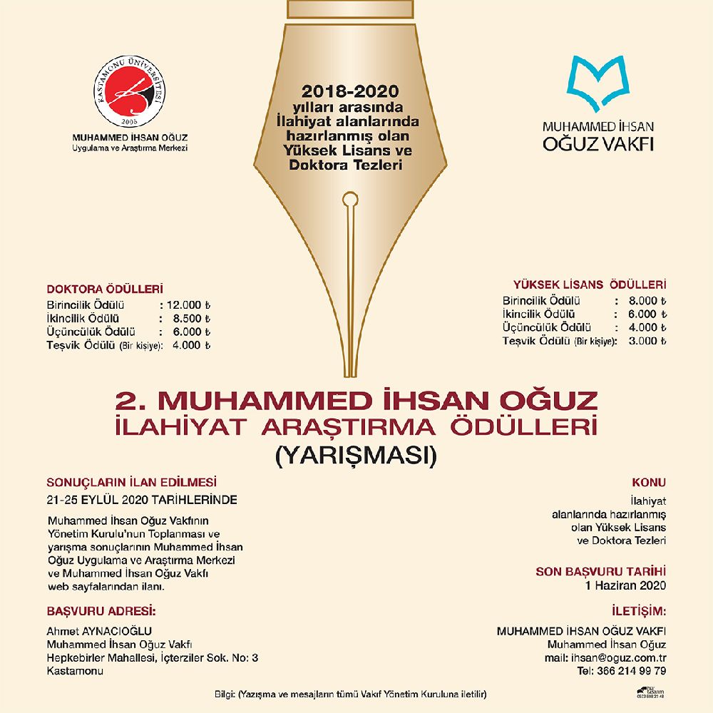 Kastamonu Üniversitesiyle beraber düzenlediğimiz ll. Muhammed İhsan Oğuz İlahiyat Araştırma Ödülleri yarışmasının koşulları Covid 19 sebebiyle 5 Mayıs itibariyle güncellenmiştir. Kamuoyunun bilgisine saygıyla duyurulur. Ayrıntılı bilgiye ulaşmak için buraya tıklayınız.